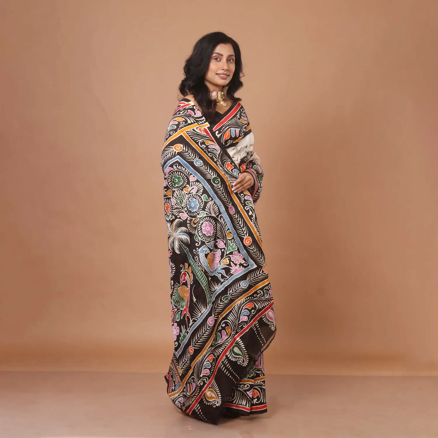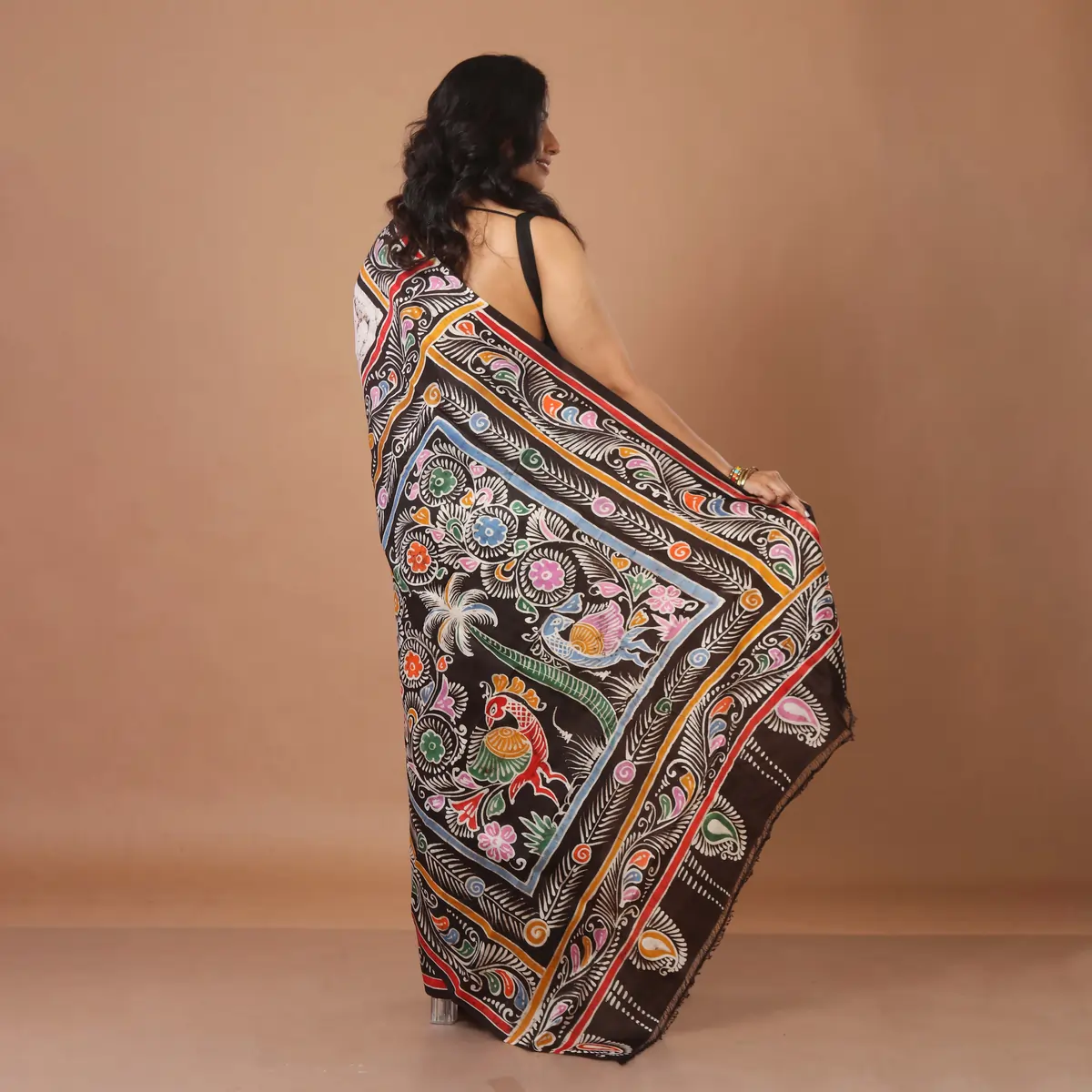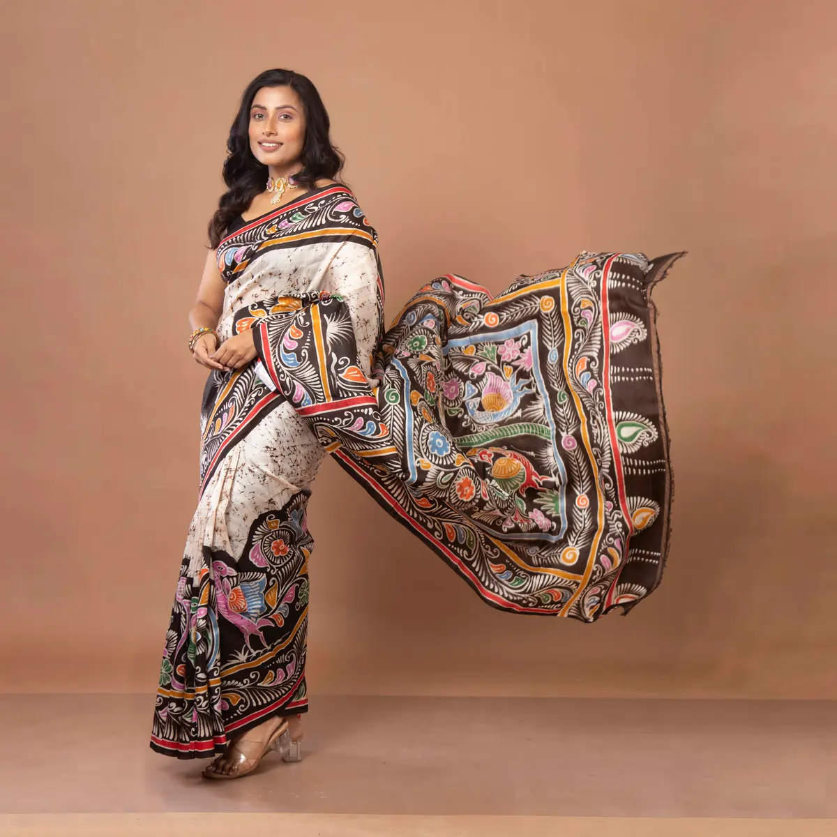 Black Crack & Fine Brush Work Hand Batik Pure Silk Saree