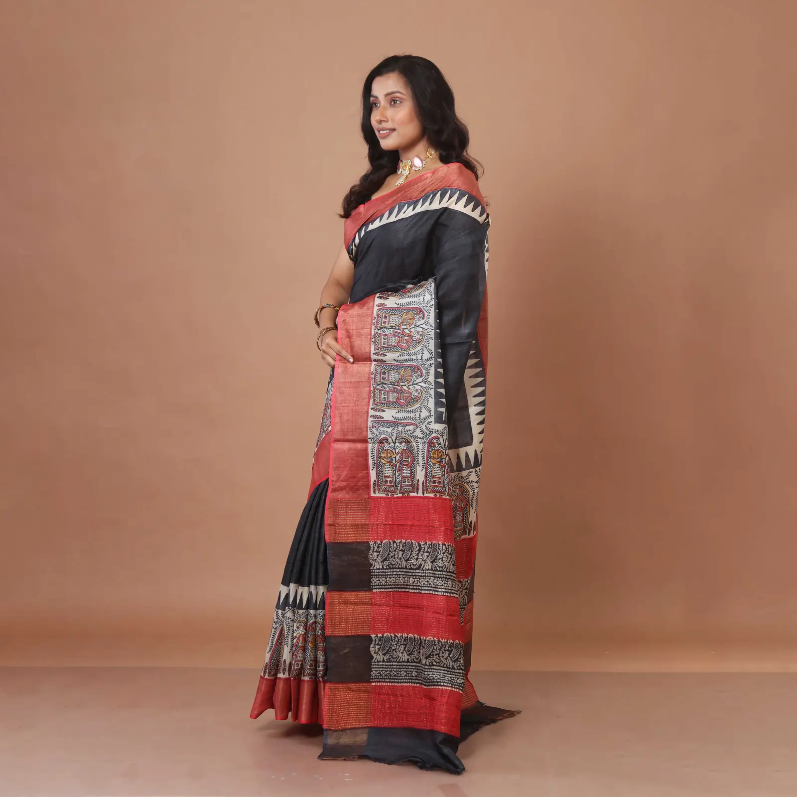 - Fabric: Crafted from pure Gachi Tussar fabric, this saree boasts the signature natural sheen and rich, uneven texture that Tussar silk is celebrated for. The fabric is sourced from Bengal, ensuring authenticity and heirloom quality.