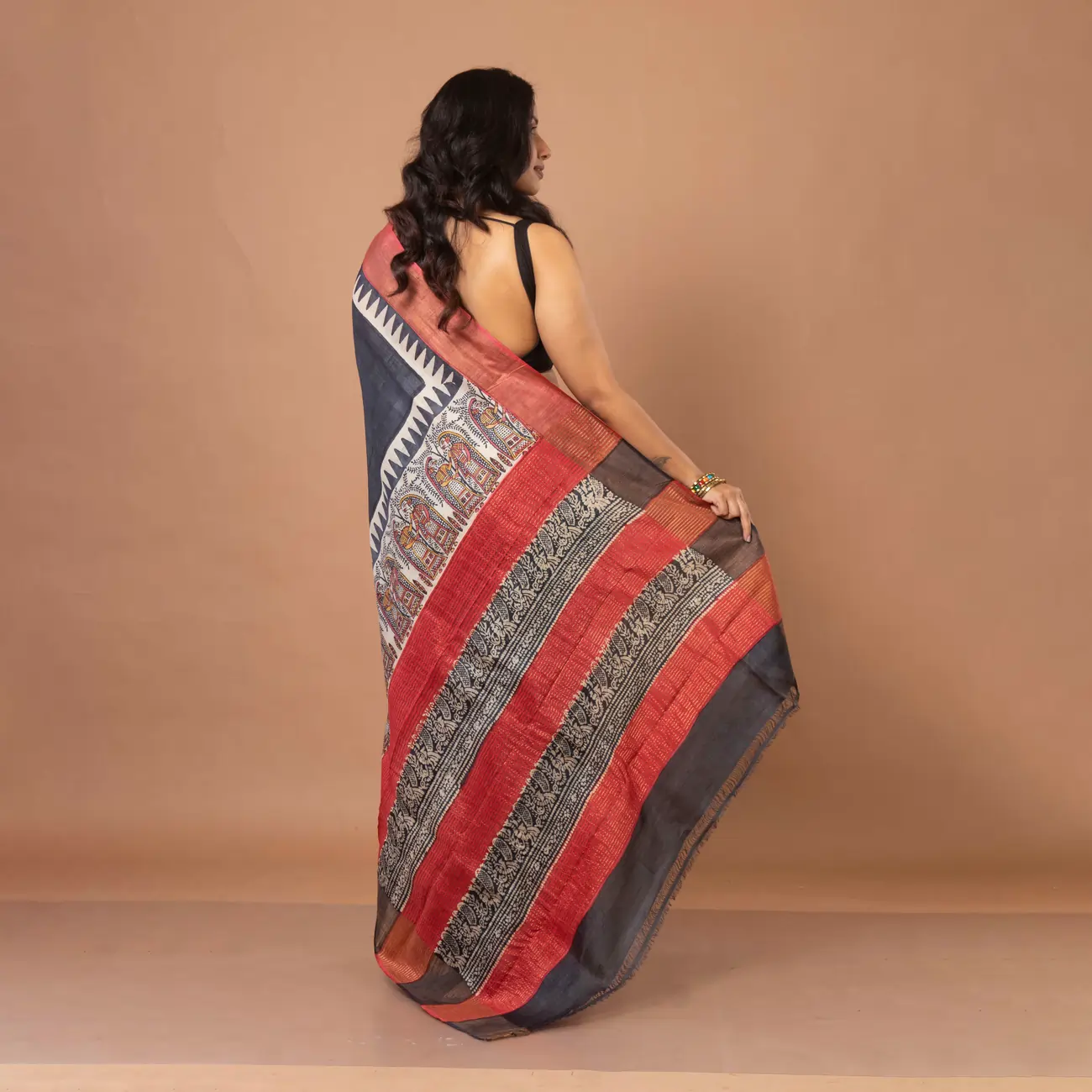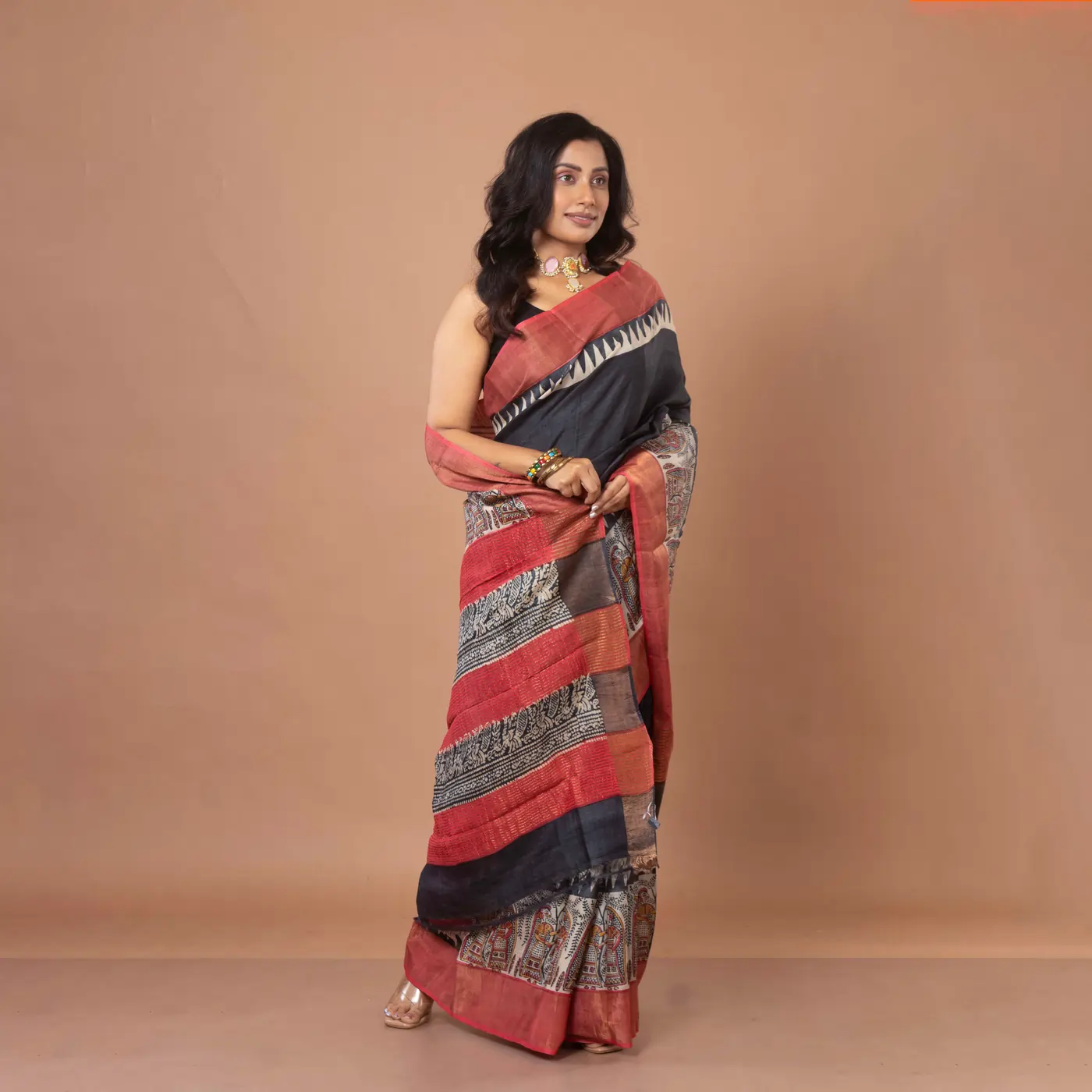 - Hand-Block Printing: Embracing traditional artistry, the saree features intricate Madhubani-style tribal motifs hand-printed across the lower pleats (anchals) and the rust-red pallu. These detailed motifs tell a story of cultural heritage, adding depth and character to the garment.