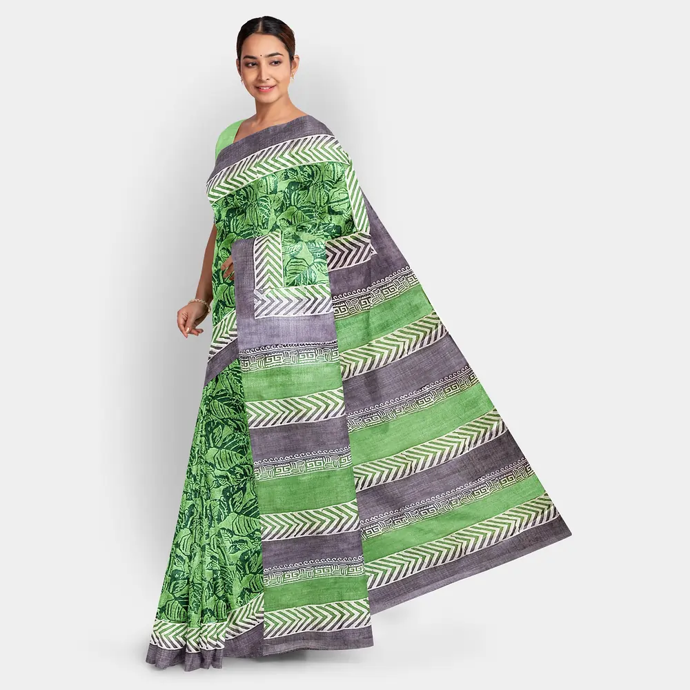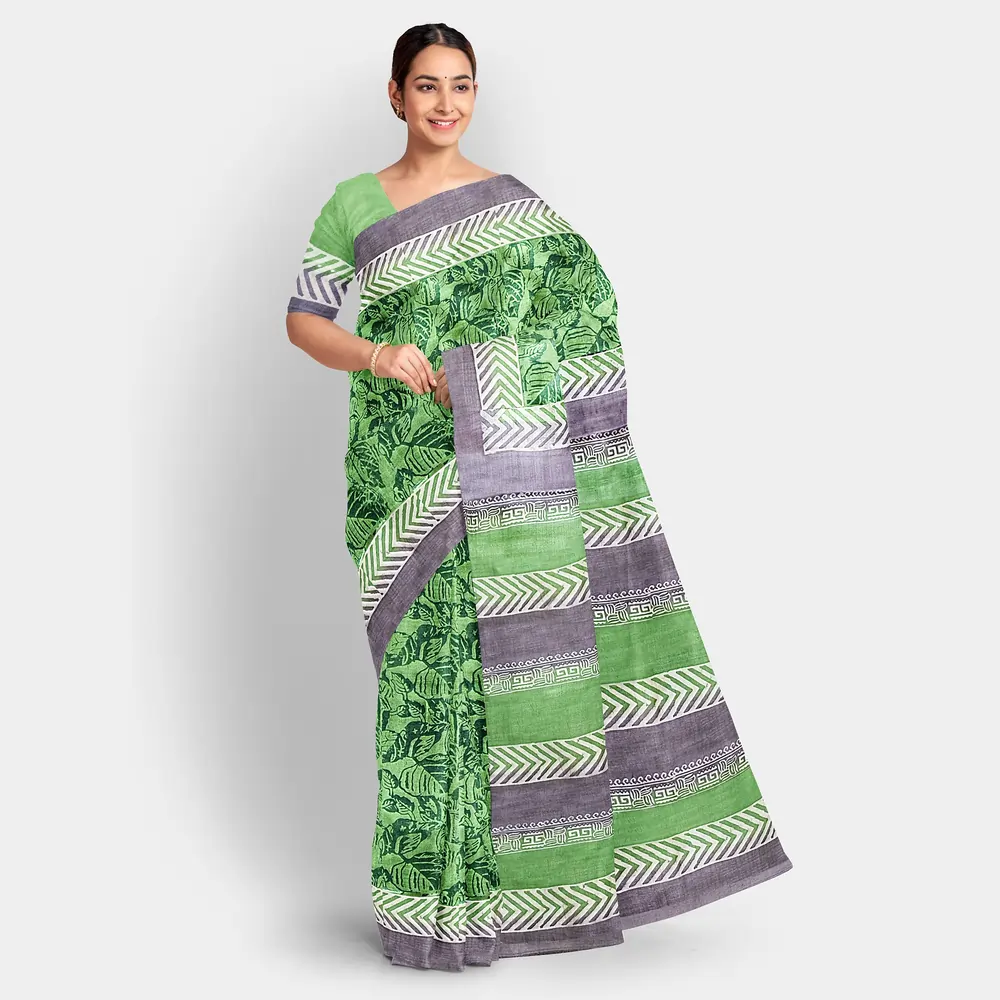 - Print: Hand-block printed leaf motifs.