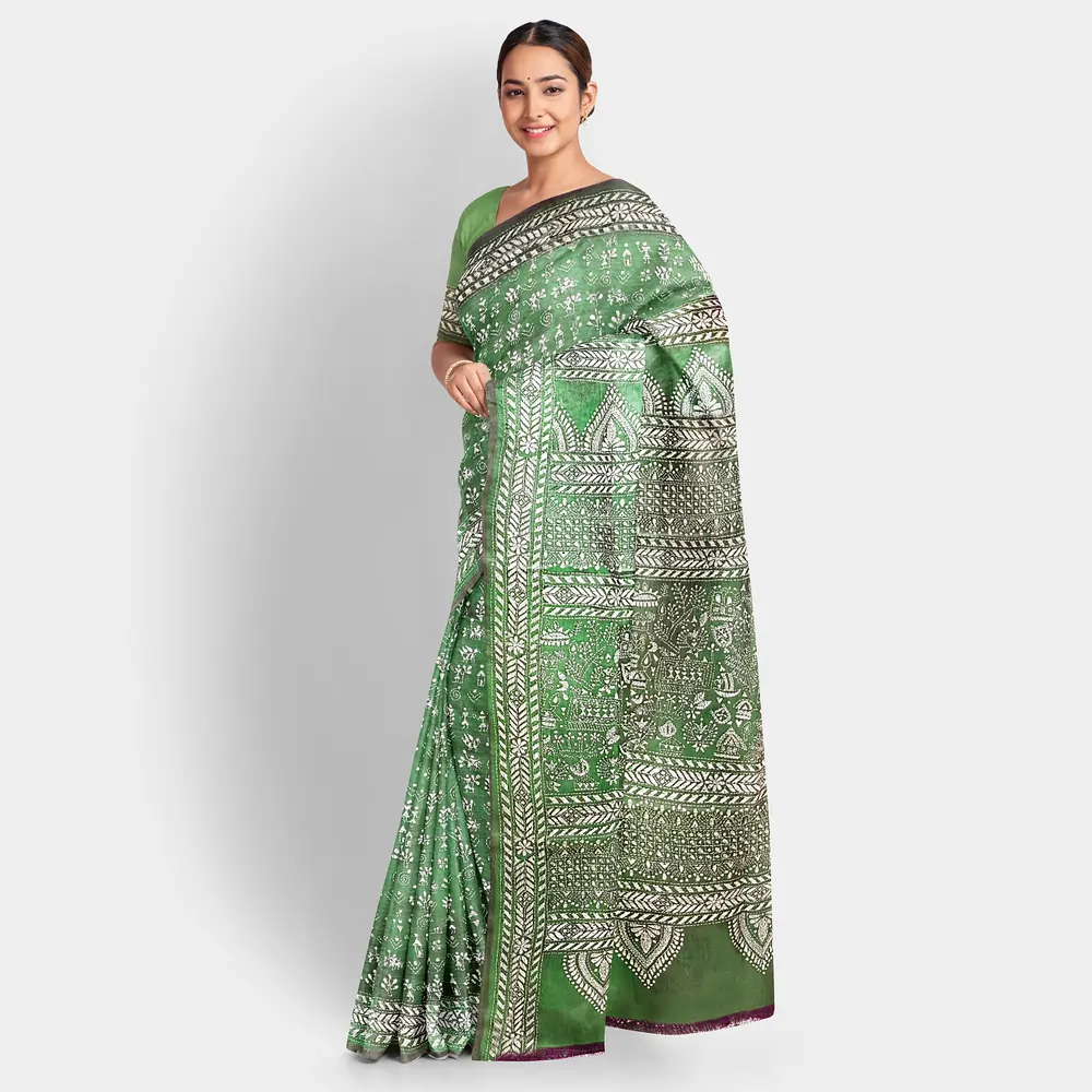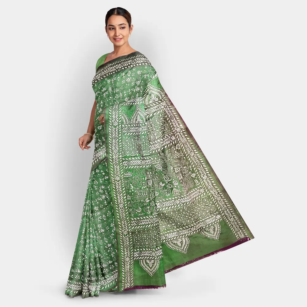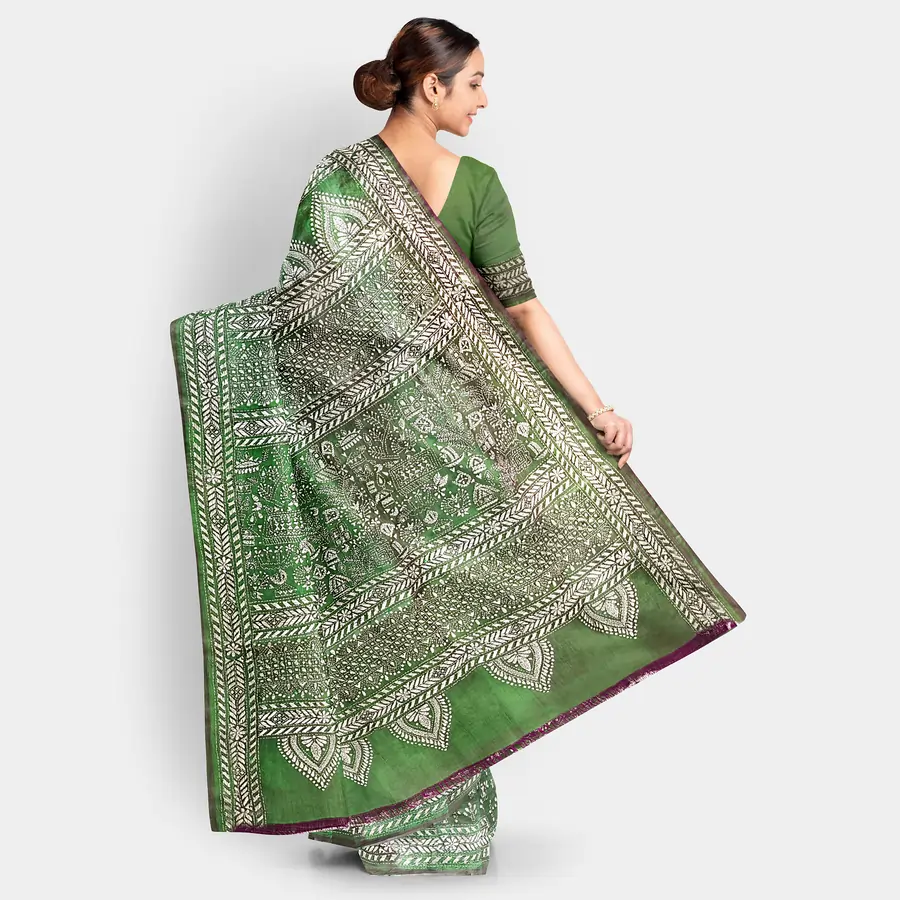 Body: The saree features a lush green canvas, meticulously hand-embroidered with fine white Madhubani-inspired Kantha stitching, creating an elegant all-over folk art pattern.