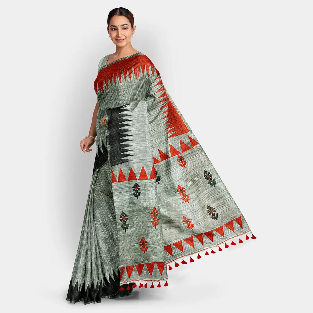 Embrace the timeless grace of this Khadi Silk Saree from the looms of Murshidabad, crafted for the modern woman who cherishes heritage. Woven from the purest Matka silk, it offers a unique texture and feather-light comfort for effortless wear. The saree features a sophisticated grey body, elegantly framed with a striking red and black border, while its pallu unfolds with grand, intricate temple and floral motifs, telling a story of traditional artistry with every fold.