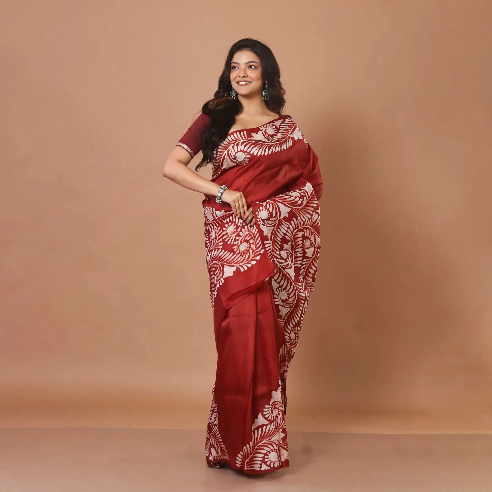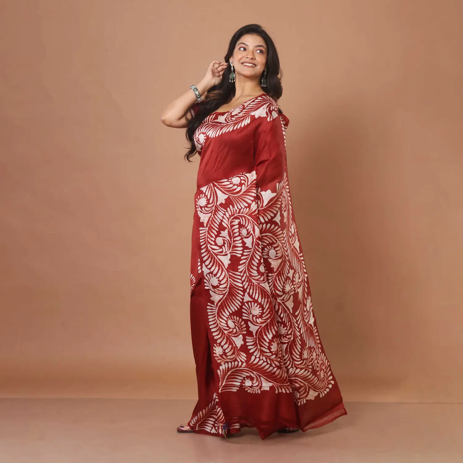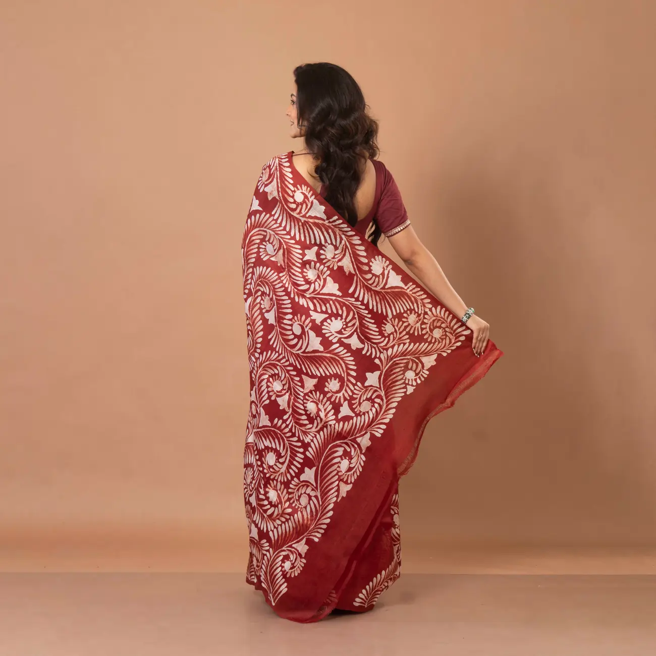 Experience the timeless allure of Bengal craftsmanship with this Pure Bishnupuri Silk Saree. Featuring the rare “Soru Tuli” Batik technique, this drape combines the richness of Maroon silk with delicate, hand-painted off-white botanicals.