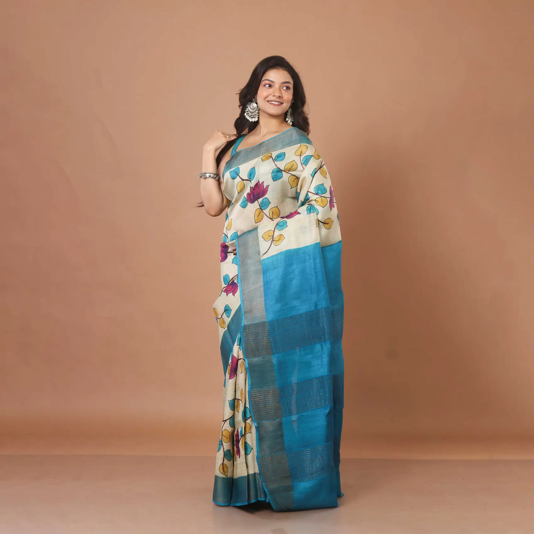 Natural Floral Zari Tussar Silk Saree with Teal Border & Rich Pallu