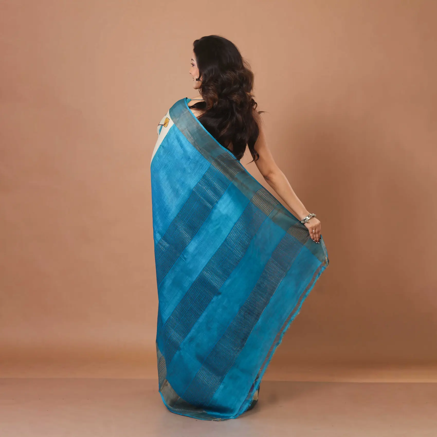 • Color Base: Natural / Off-White with Teal Blue Border & Pallu