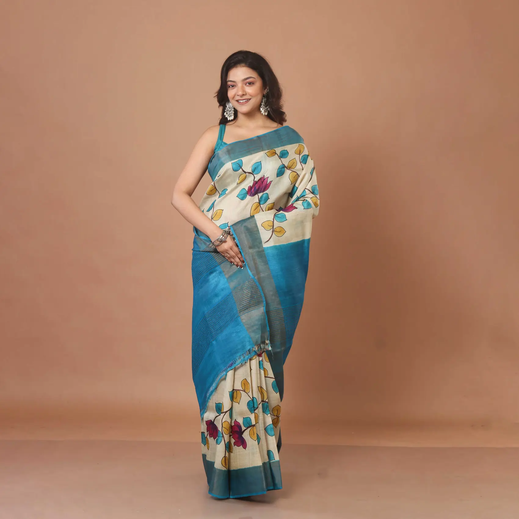 The Design: Set against a soft, natural base, the saree features vibrant floral motifs in contrasting hues, creating an artistic, garden-fresh appeal. The true showstopper is the rich teal blue pallu and border, lavishly accented with pure golden zari. Subtle striped patterns woven into the border add depth and a sophisticated geometric rhythm to the drape.
