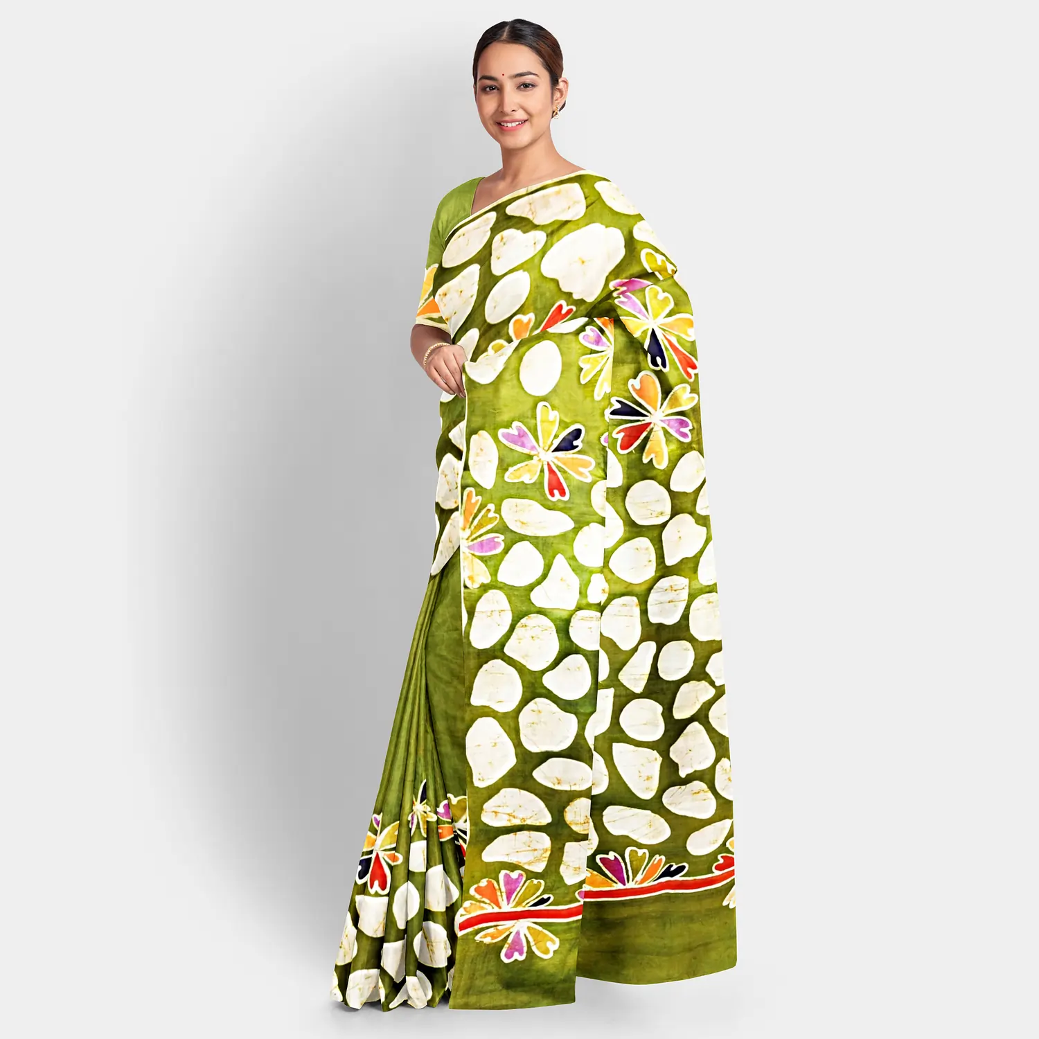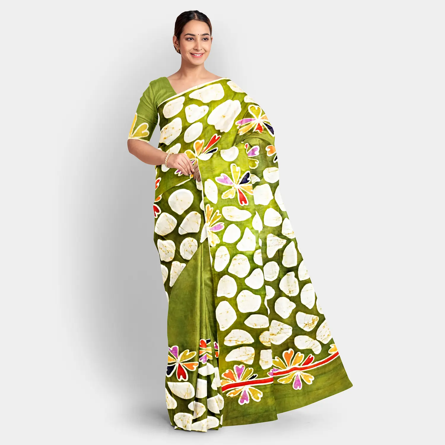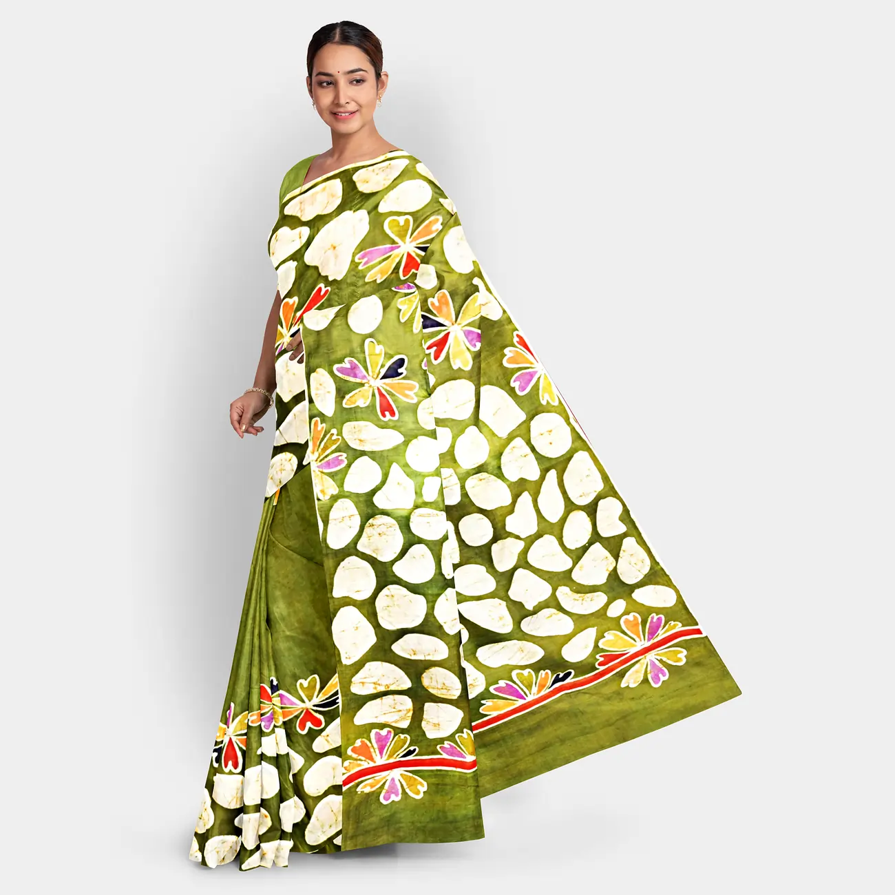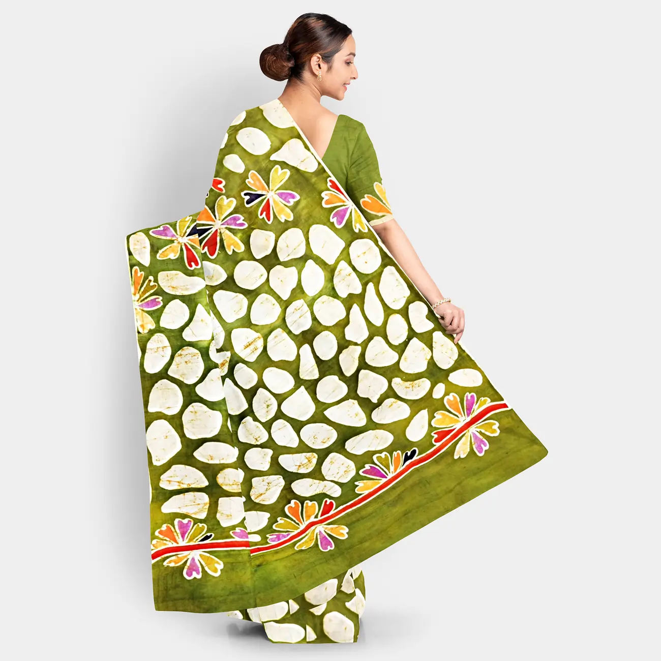Parrot Green With Geometrical & Floral Batik Work Silk Saree