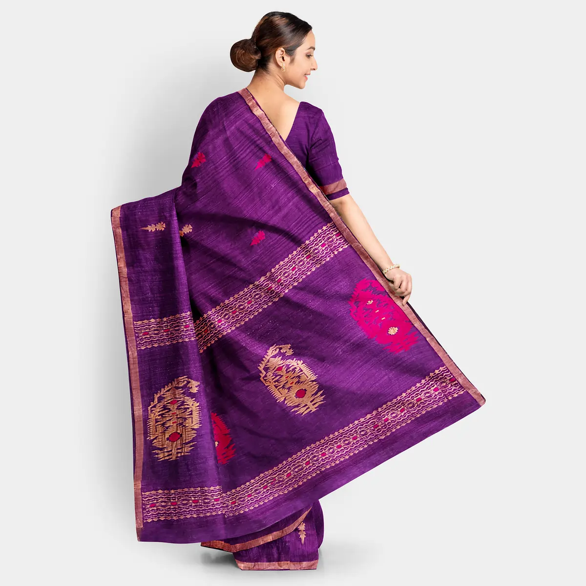 Draped in a regal purple, this saree features a body adorned with delicate jamdani motifs, elegantly framed by a solid border and culminating in a grand, jamdani-woven pallu. Lovingly crafted from the purest Murshidabad Khadi Matka silk, it offers a unique blend of textured comfort, earthy elegance, and authentic heritage, making your drape a true work of art.