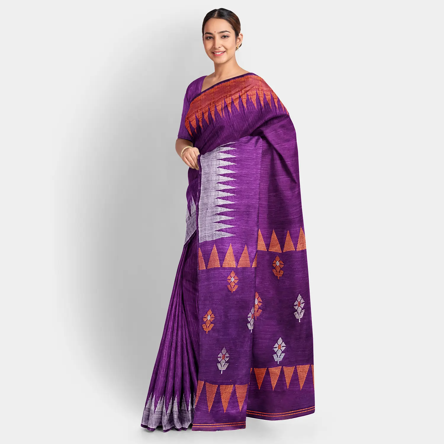 Crafted from pure Murshidabad matka silk, this elegant saree features a solid purple base with a copper and silver border. The pallu is adorned with intricate temple and floral motifs, creating a regal look. It includes a 1-meter blouse piece, with a total length of 6.5 meters. For care, hand wash in cold water and dry in the shade.
