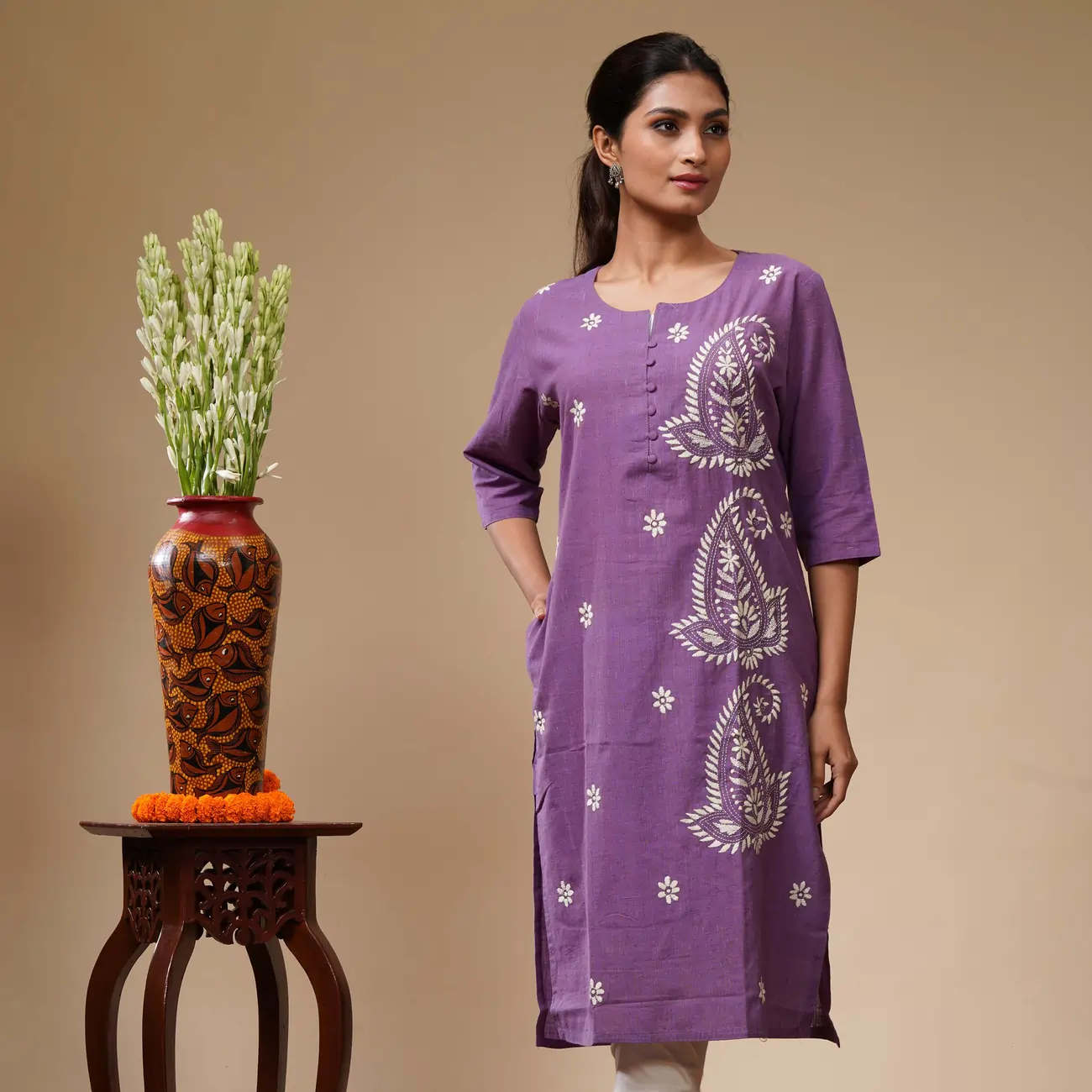 Immerse yourself in the legacy of Bengal’s textile heritage. This purple kurta is not merely an outfit; it’s a canvas of artistry, woven with care and embroidered with stories, designed for the woman who values authenticity and conscious elegance.