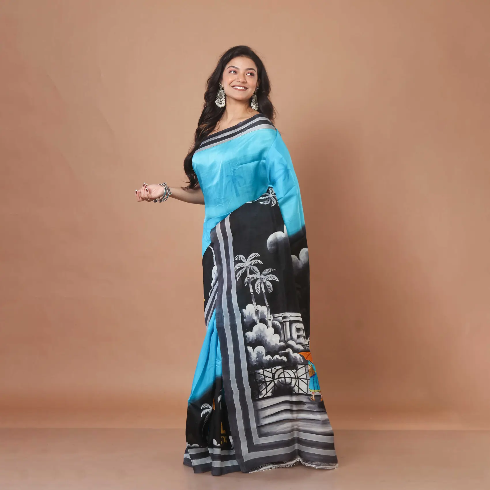 Drenched in a celestial sky-blue hue, the fabric is brought to life with dramatic accents of deep black. The juxtaposition creates a mesmerizing depth, while the pure silk base lends a refined, natural luster that catches the light with every step you take.