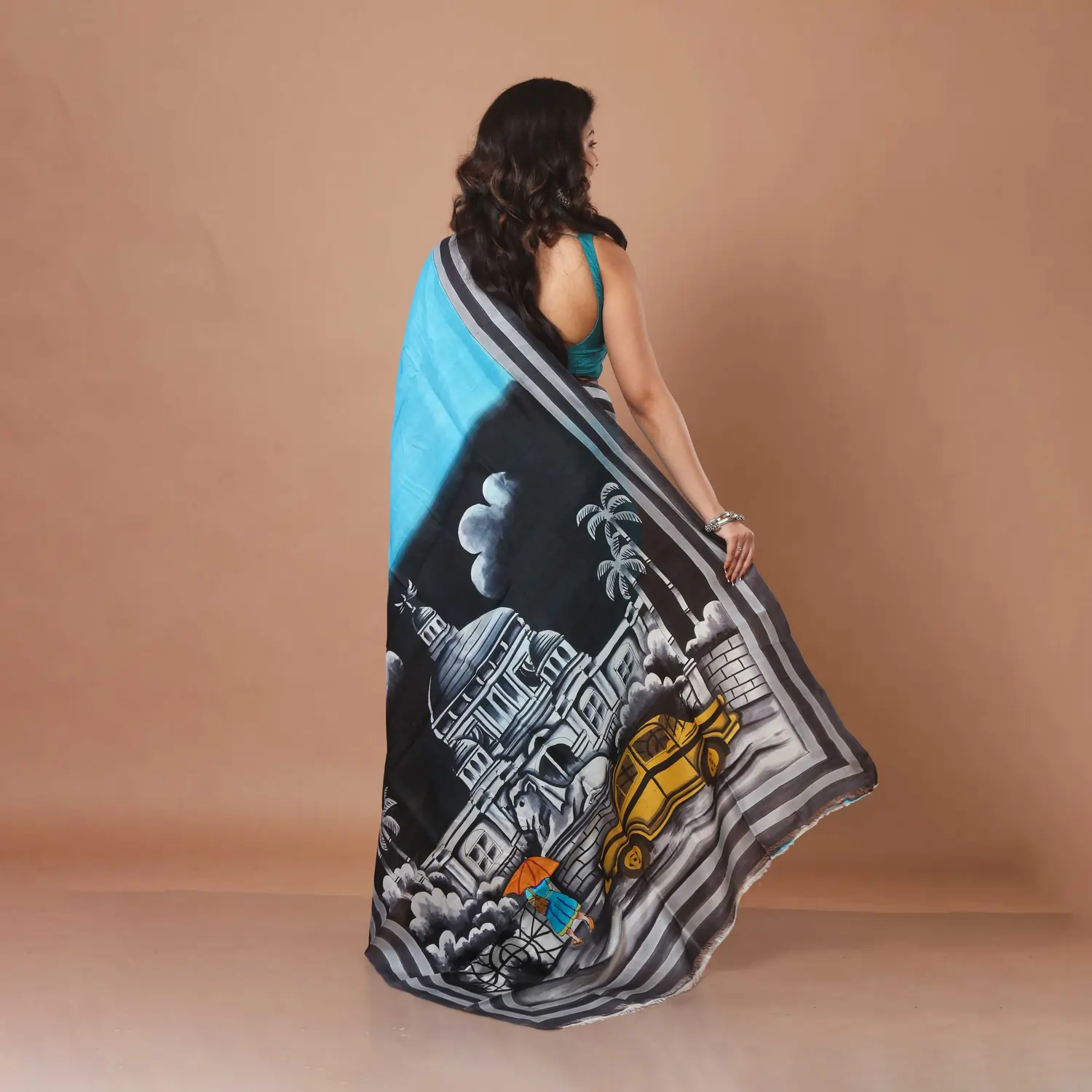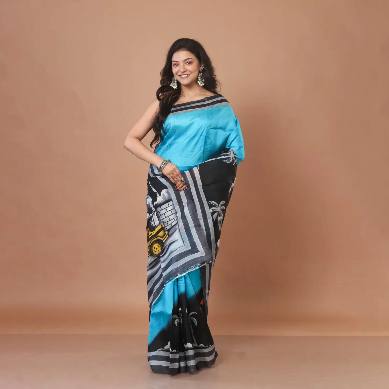 Meticulously brought to life using traditional hand-painting and hand-printing techniques, this saree transcends the ordinary. Its borders and flowing pallu feature artistic scenic motifs—a dreamy landscape of swaying palm trees and a whimsical, distinctive yellow vehicle. This narrative element makes the saree a unique conversation starter.