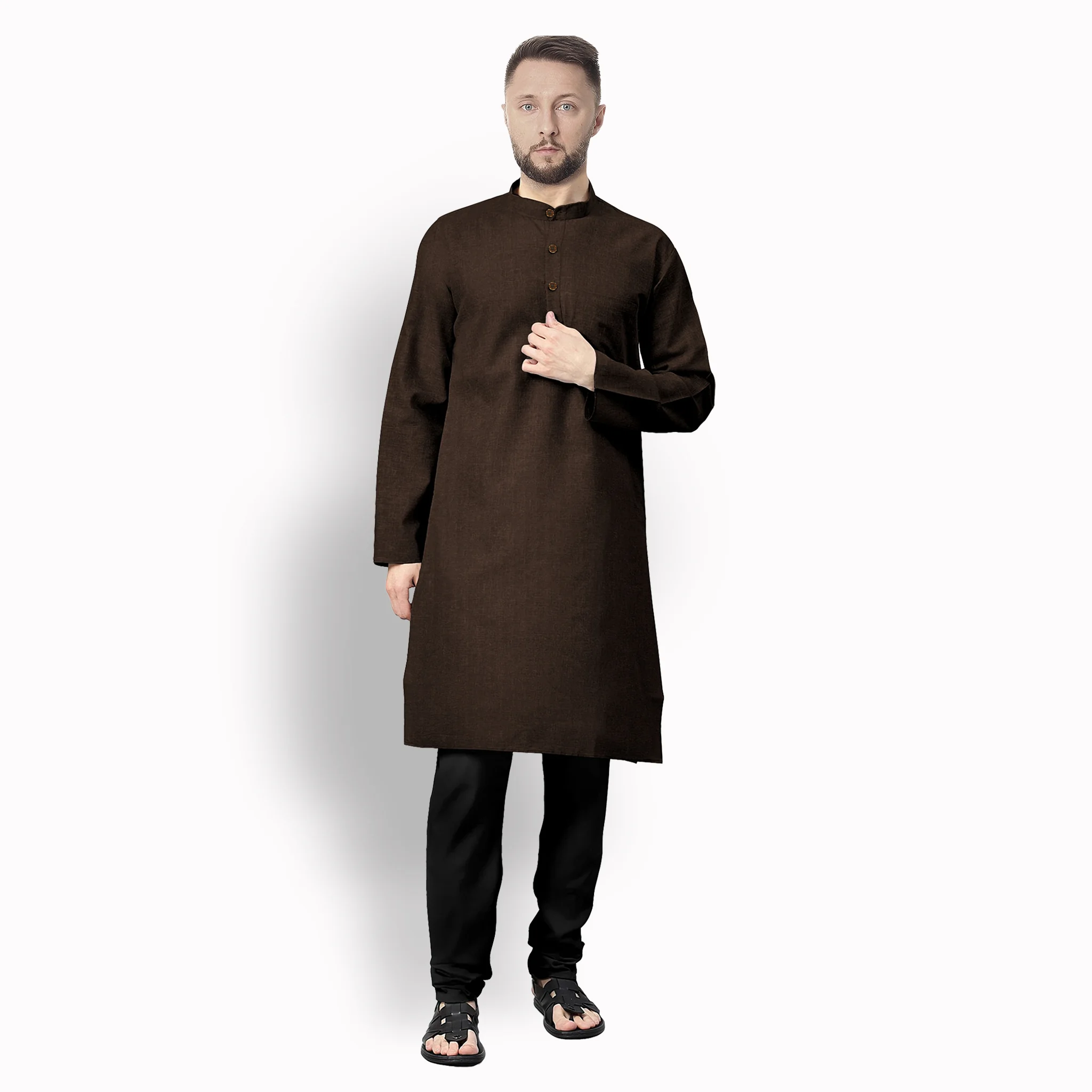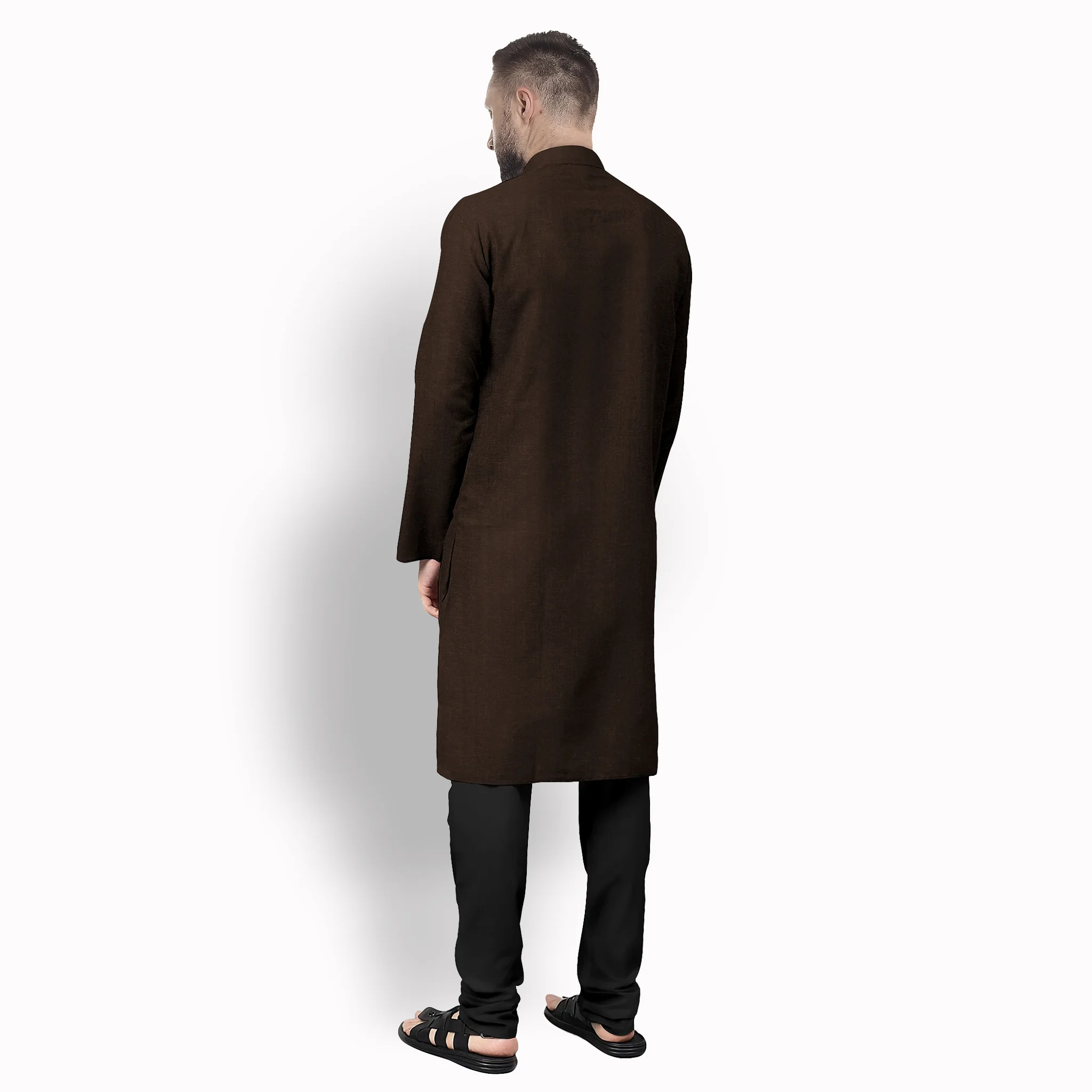 Dressed in a solid, deep dark brown, this kurta exudes quiet confidence. The versatile color pairs effortlessly with white churidars, trousers, or dhotis.