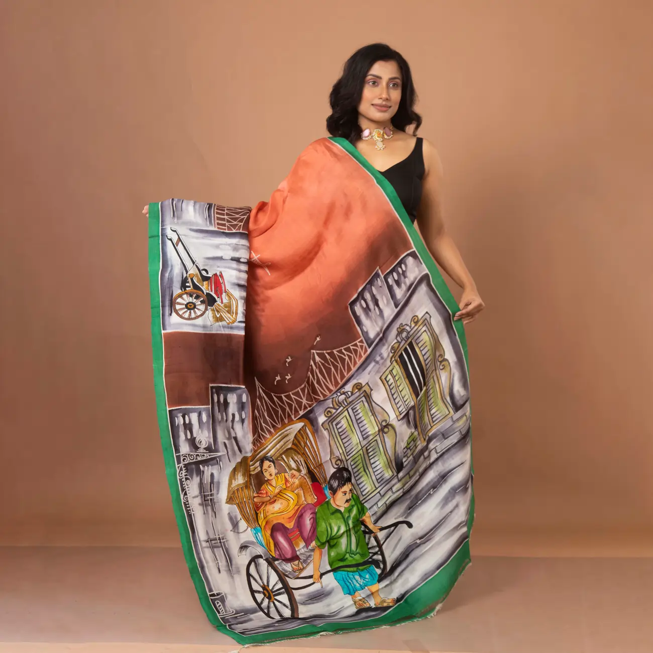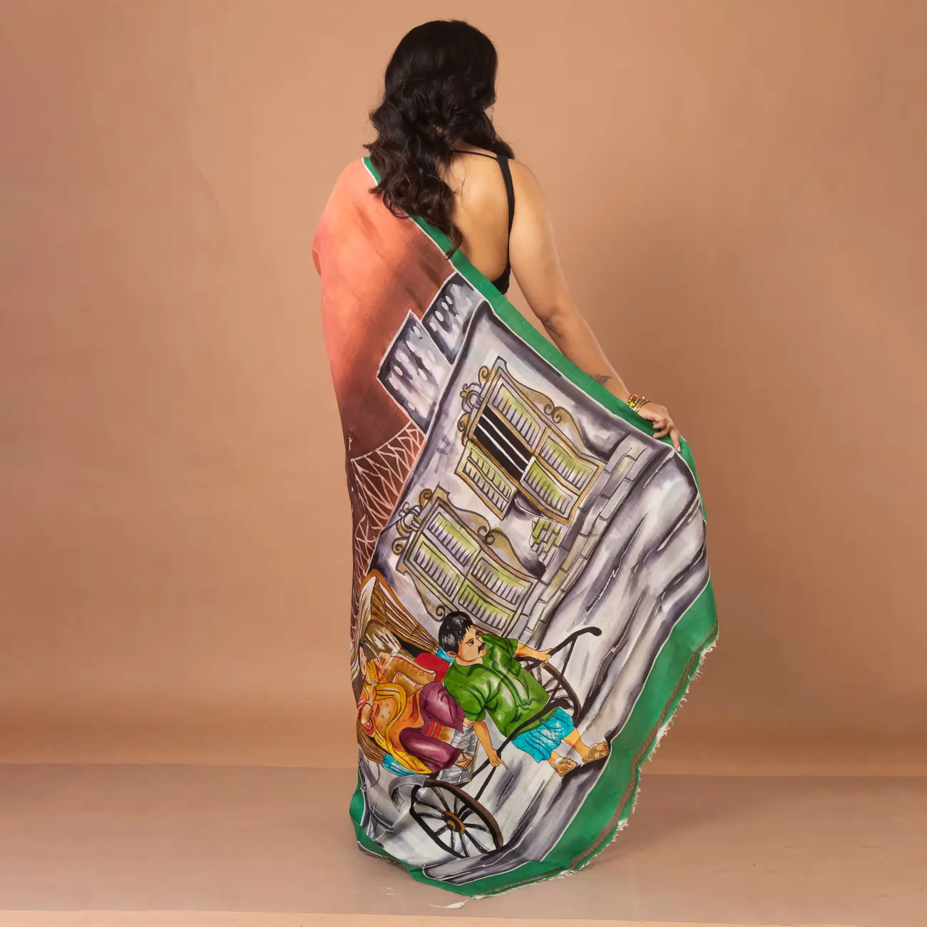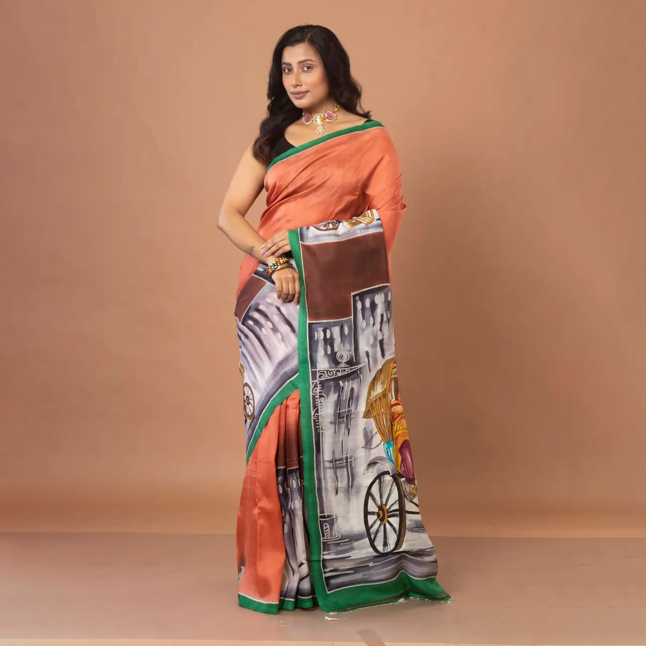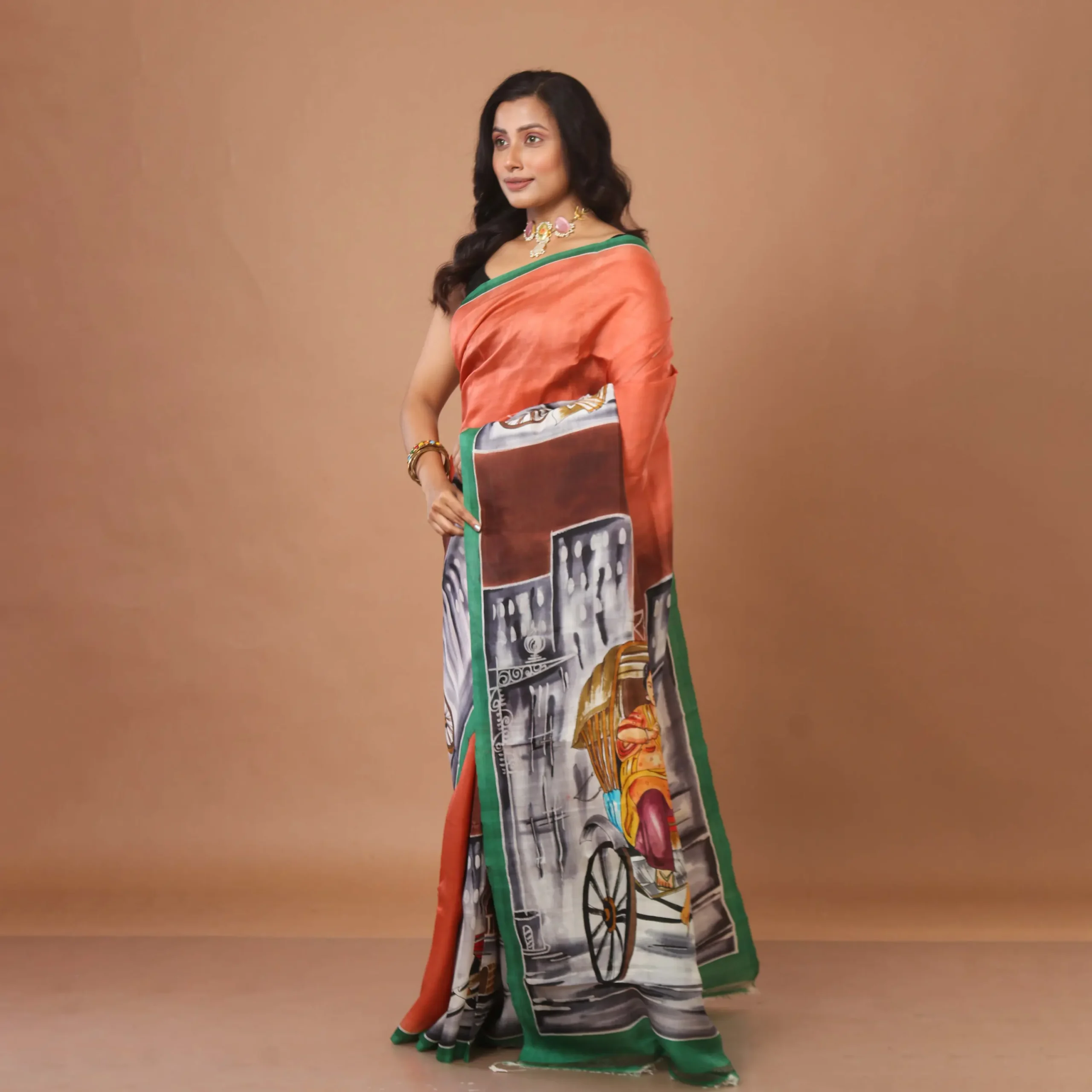 Terracotta Orange With Hand-Painted Urban Mural Bishnupuri Silk Saree