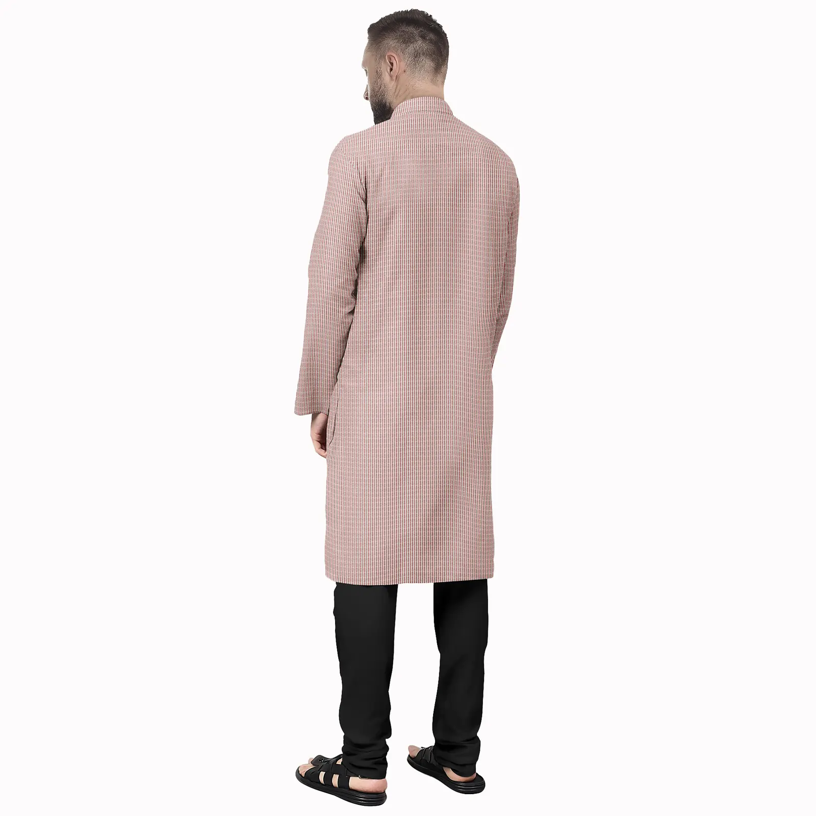Embrace artisan elegance with our handcrafted Khadi cotton kurta, woven from the finest threads in Bengal. The striking red and white stripe design blends traditional charm with modern minimalism. Featuring a mandarin collar, wooden buttons, full sleeves, and functional side pockets, this kurta offers unparalleled comfort and style for the conscious wardrobe.